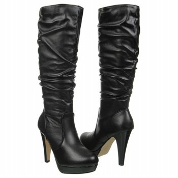 - Faux leather upper in a dress knee-high slouch pull-on platform boot style
